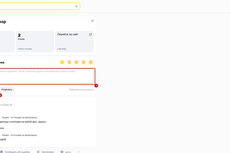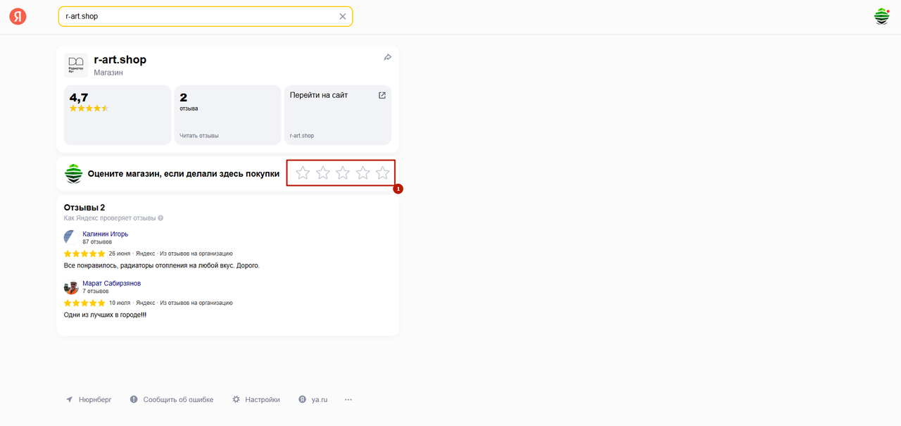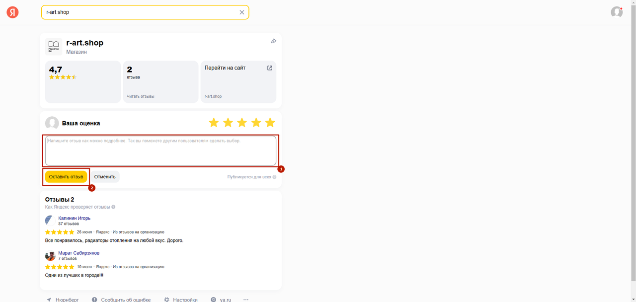 1. Перейдите на страницу с отзывами сайта нашего интернет-магазина r-art.shop. (При необходимости Авторизуйтесь в своем профиле Яндекс)