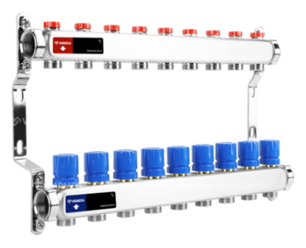 Коллекторные группы предварительной сборки из нержавеющей стали с балансировочными и термостатическими вентилями марки Varmega предназначены для распределения и регулирования потоков теплоносителя в низко- и высокотемпературных системах отопления. Оснащены балансировочными вентилями на подающем коллекторе и термостатическими вентилями с размером M30x1,5 (с возможностью установки термоэлектрических приводов) на обратном коллекторе. Каждый коллектор подвергается в заводских условиях проверке на функционирование и герметичность уплотнений.