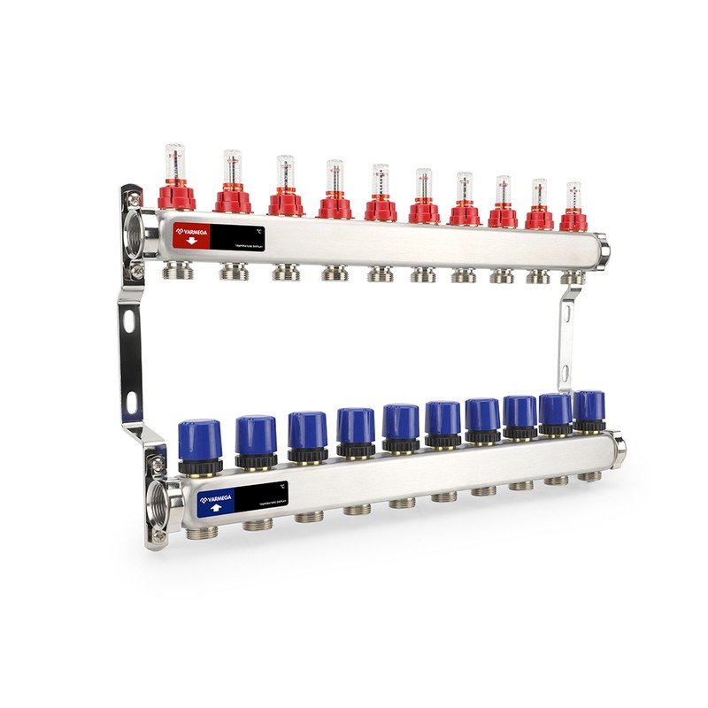 Коллекторные группы предварительной сборки из нержавеющей стали с расходомерами марки Varmega предназначены для распределения и регулирования потоков теплоносителя в низкотемпературных системах отопления (напольное отопление). Оснащены расходомерами на подающем коллекторе и термостатическими вентилями с размером M30x1,5 (с возможностью установки термоэлектрических приводов) на обратном коллекторе. Каждый коллектор подвергается в заводских условиях проверке на функционирование и герметичность уплотнений.