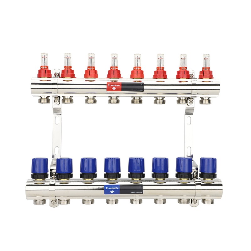 Коллекторные группы предварительной сборки из нержавеющей стали с расходомерами марки Varmega предназначены для распределения и регулирования потоков теплоносителя в низкотемпературных системах отопления (напольное отопление). Оснащены расходомерами на подающем коллекторе и термостатическими вентилями с размером M30x1,5 (с возможностью установки термоэлектрических приводов) на обратном коллекторе. Каждый коллектор подвергается в заводских условиях проверке на функционирование и герметичность уплотнений.