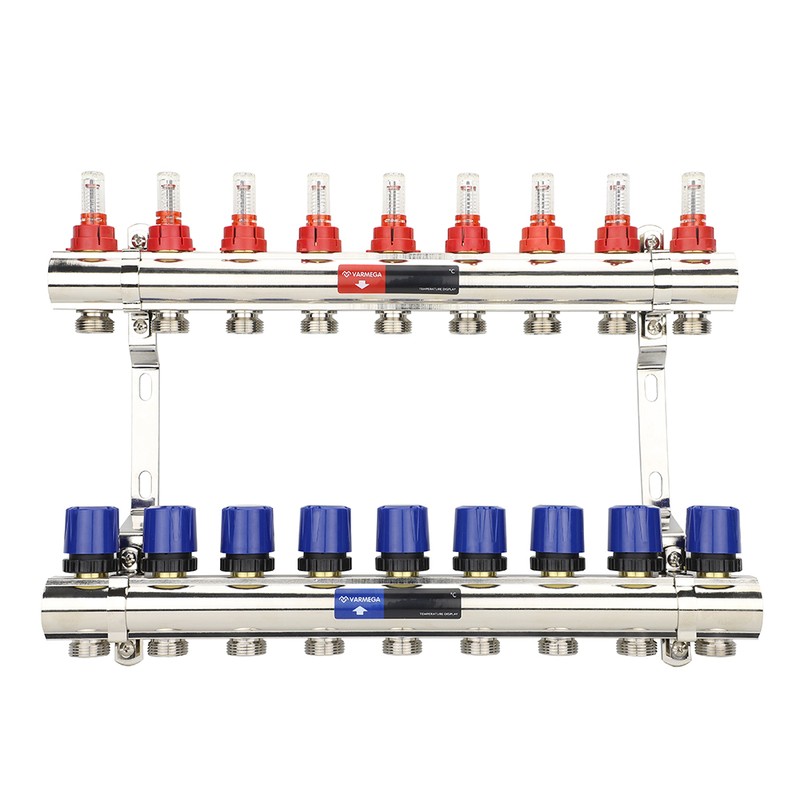 Коллекторные группы предварительной сборки из нержавеющей стали с расходомерами марки Varmega предназначены для распределения и регулирования потоков теплоносителя в низкотемпературных системах отопления (напольное отопление). Оснащены расходомерами на подающем коллекторе и термостатическими вентилями с размером M30x1,5 (с возможностью установки термоэлектрических приводов) на обратном коллекторе. Каждый коллектор подвергается в заводских условиях проверке на функционирование и герметичность уплотнений.
