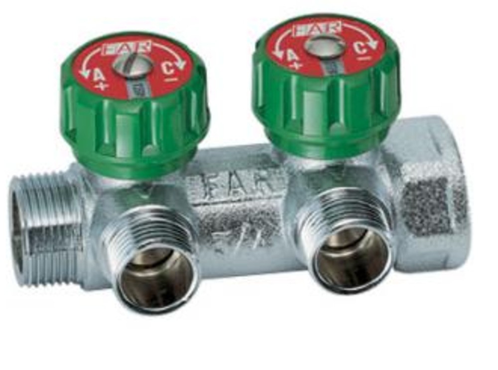 Хромированный модульный коллектор с 2 отводами.Снабжён регулирующими вентилями с двусторонним диском «СИНИЙ-КРАСНЫЙ» и диском с обозначением для сантехнических установок или отопительных систем.