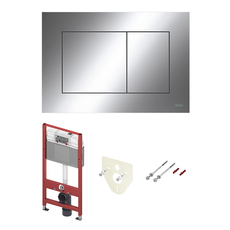 - Комплект для установки унитаза: застенный модуль, пластиковая панель смыва TECEnow, хром глянцевый
