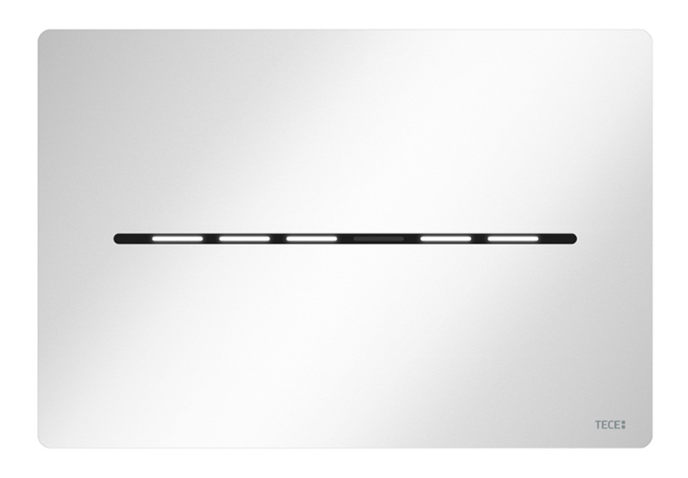 Электронная панель смыва с гигиеничной бесконтактной активацией смыва для стандартных бачков ТЕСЕ (глубиной 13 см) с фронтальной активацией и высотой высотой установки около 1 м (центр панели смыва). Плоская панель из нержавеющей стали в комплекте с крепежными элементами и электроприводом смыва для систем двойного смыва. Совместима с контейнером для гигиенических таблеток.