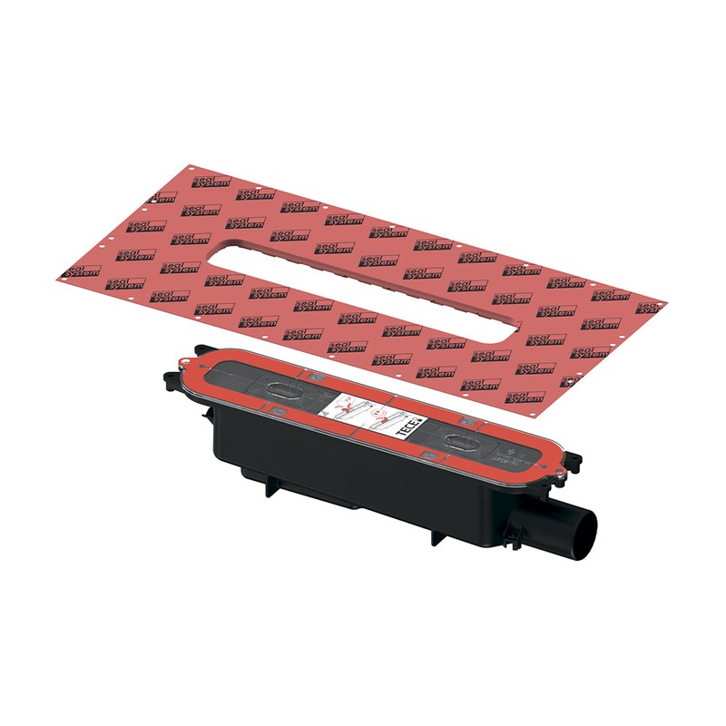 Сифон для душевого профиля TECEdrainprofile для установки в бетонной стяжке. Для горизонтального подсоединения канализационной трубы DN 40. Установленная на заводе гидроизоляционная манжета SealSystem с защелкой для монтажа в композитной гидроизоляции в соответствии с DIN 18534