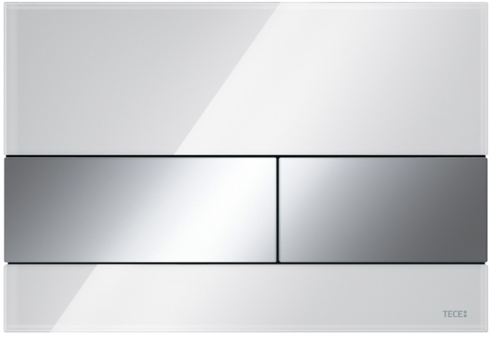 Панель смыва для смывных бачков TECE, фронтальная или верхняя установка. Плоская стеклянная панель смыва с двумя установленными на пружинах клавишами привода кулисного типа. Подходит для монтажа на уровне стены вместе с монтажной рамкой унитаза для монтажа на уровне стены (например, арт. 9240649). Совместима с контейнером для гигиенических таблеток.