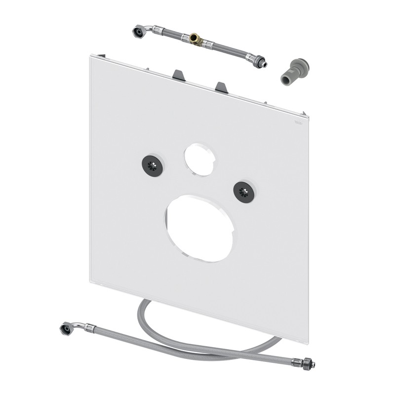 Нижняя стеклянная панель для установки унитазов-биде Duravit SensoWash C, а также Slim или Villeroy & Boch Viclean L, в комплекте со звукоизолирующей прокладкой, отводом для подключения воды внутри бачка и шлангом для подводки воды.
