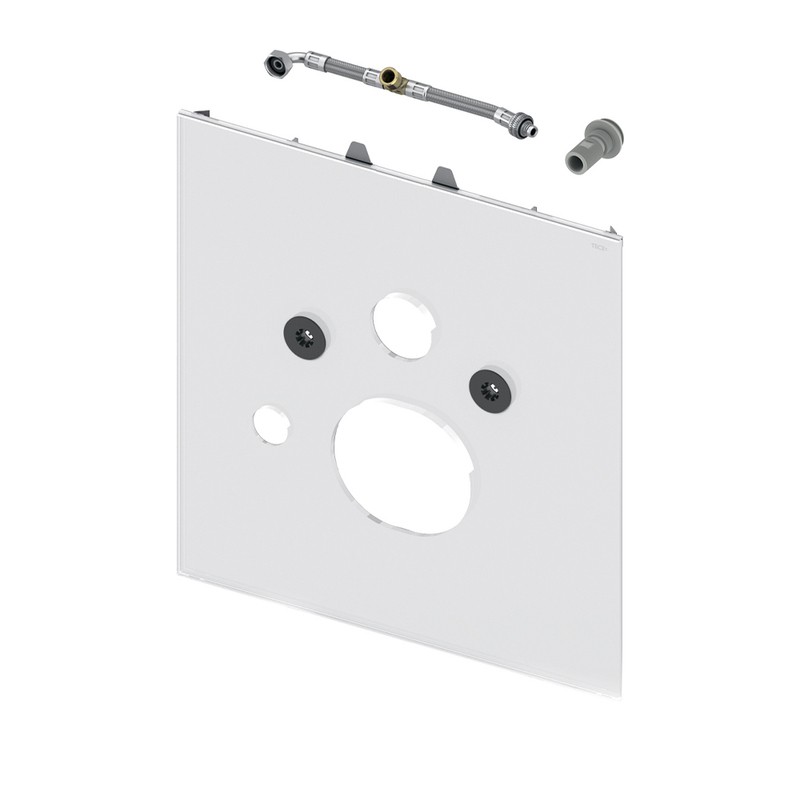 Нижняя стеклянная панель для установки унитазов-биде Geberit Aquaclean Sela, Mera и Tuma, Toto Washlet SG, Toto Washlet EK или GL со скрытыми подключениями, Grohe Sensia, V & B ViClean U+ или Laufen Riva в комплекте со звукоизолирующей прокладкой и сменным армированным шлангом для подключения воды внутри бачка.